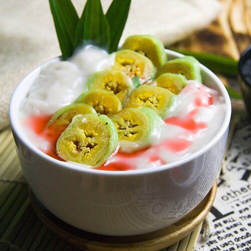- Potong pisang ijo, tata di mangkuk, beri saus santan, sirup cocopandan, dan es batu.