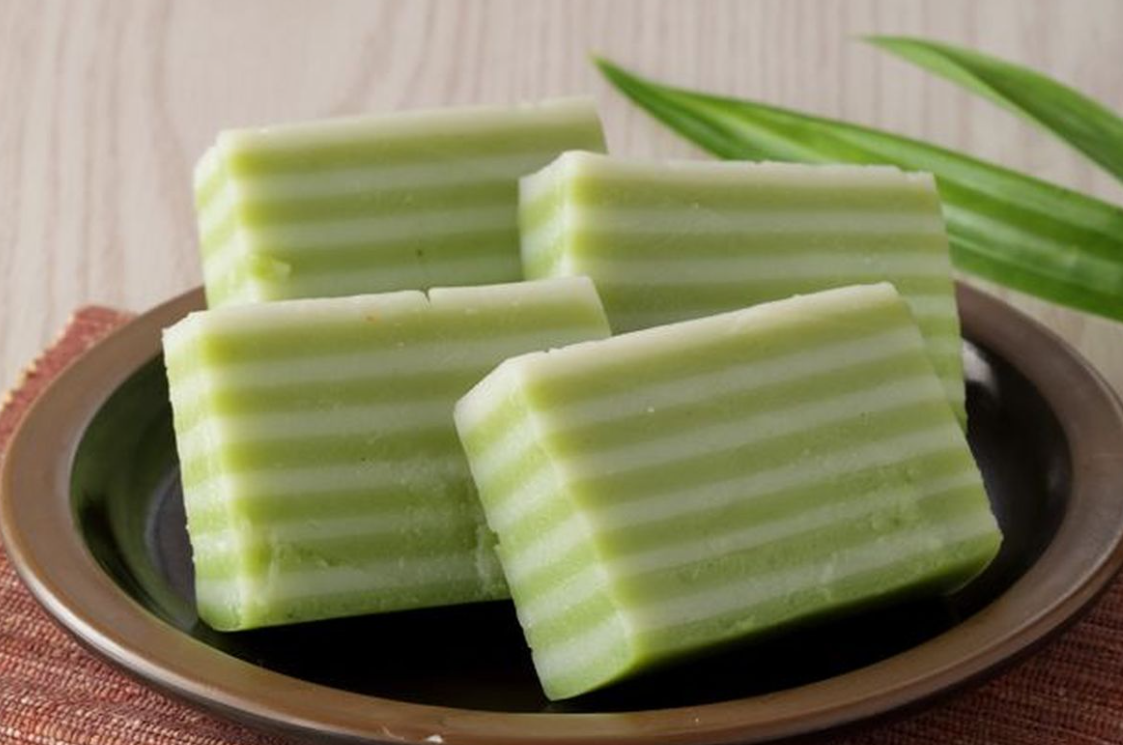 - Tuang adonan selapis demi selapis ke loyang panas, kukus tiap lapisan hingga set.