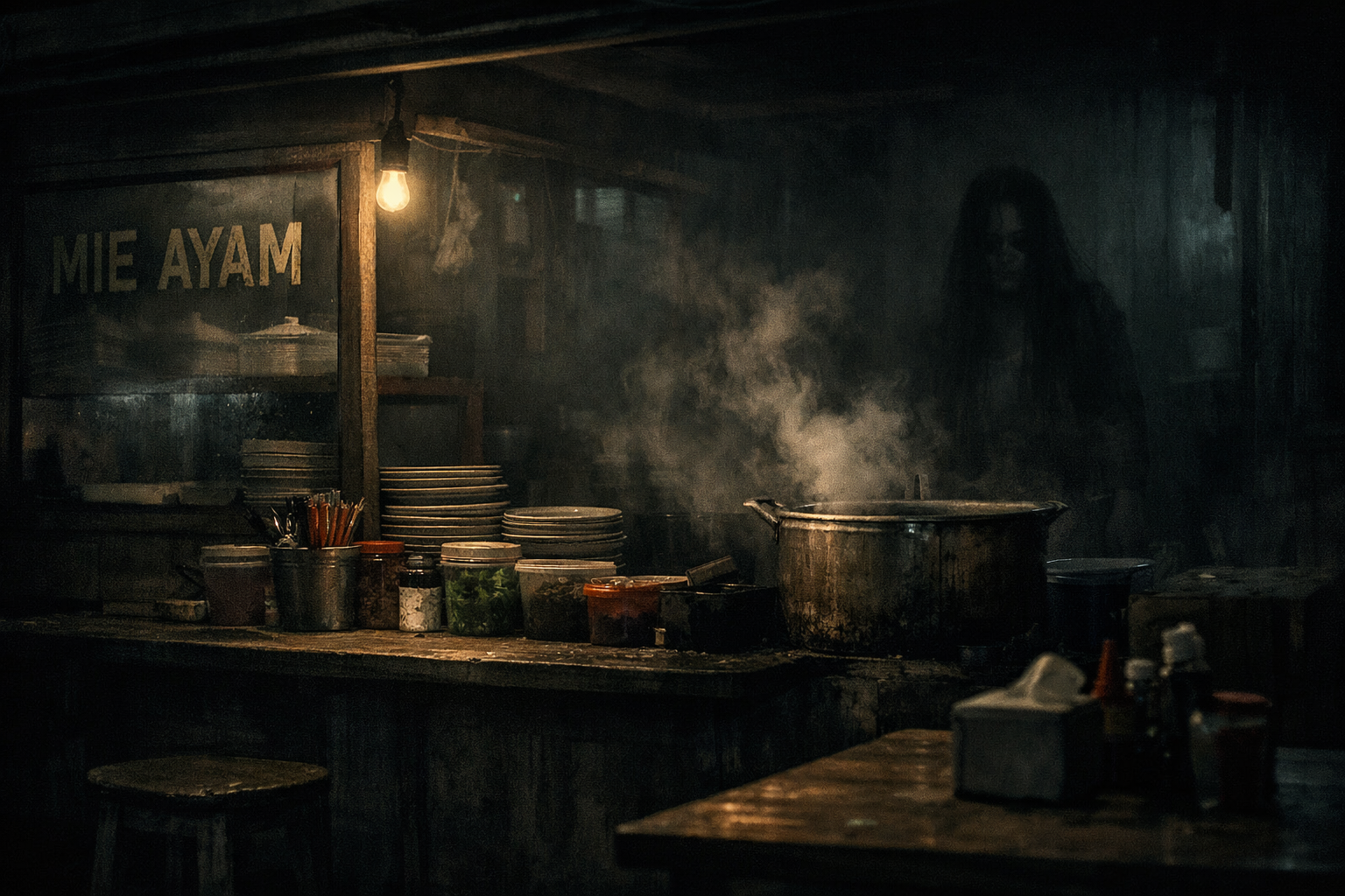 Suatu ketika, saat Raka sedang menikmati semangkuk mie ayam di warung tersebut, ia melihat sesuatu yang membuatnya merinding ketakutan. Dari balik tirai dapur, ia melihat sosok putih tinggi yang terbungkus kain kafan kotor. Ya, itu adalah pocong. Sosok tersebut menunduk dan meludah ke dalam panci rebusan mie. Air liur hitam menetes perlahan, membuat kuah mendidih mengeluarkan suara aneh.